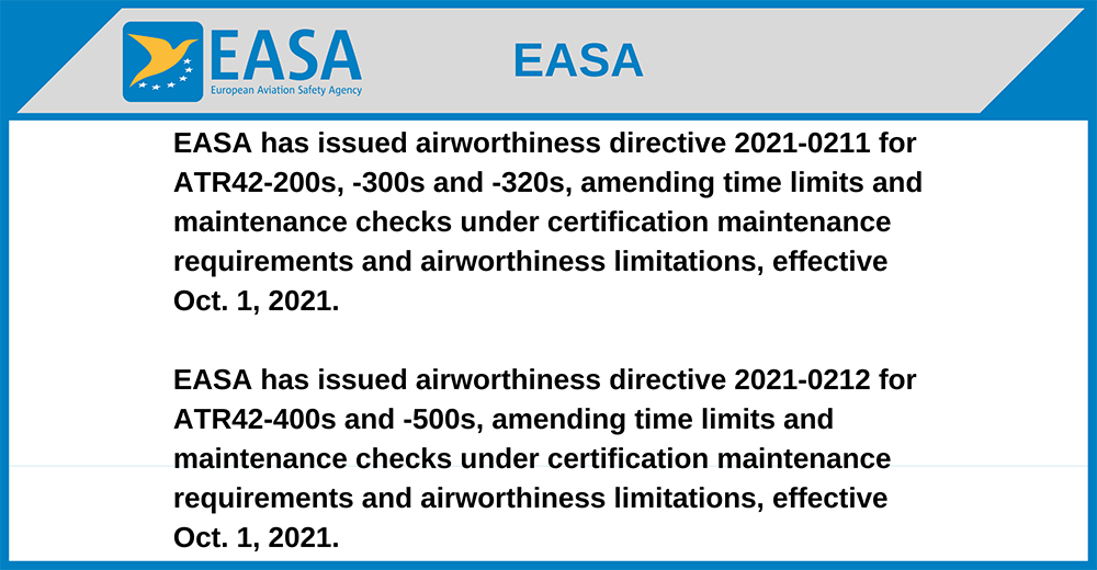 EASA has issued airworthiness directive 2021-0212 for ATR42-400s and -500s, amending time limits and maintenance checks under certification maintenance requirements and airworthiness limitations, effective Oct. 1, 2021.