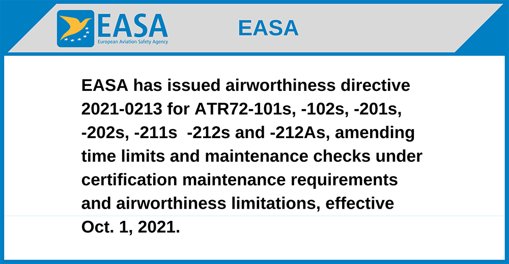 EASA has issued airworthiness directive 2021-0213 for ATR72-101s, -102s, -201s, -202s, -211s -212s and -212As, amending time limits and maintenance checks under certification maintenance requirements and airworthiness limitations, effective Oct. 1, 2021.