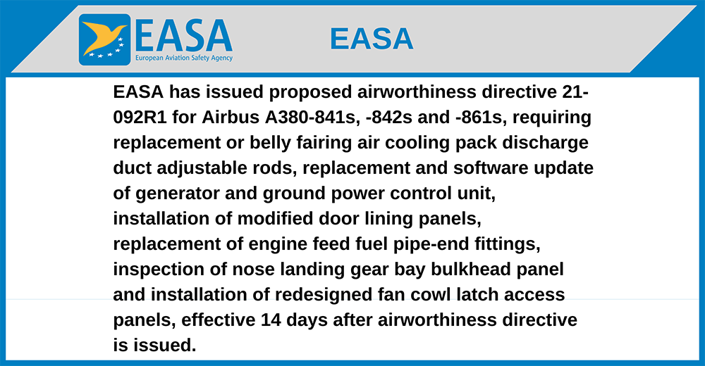 EASA has issued proposed airworthiness directive 21-092R1 for Airbus A380-841s, -842s and -861s, requiring replacement or belly fairing air cooling pack discharge duct adjustable rods, replacement and software update of generator and ground power control unit, installation of modified door lining panels, replacement of engine feed fuel pipe-end fittings, inspection of nose landing gear bay bulkhead panel and installation of redesigned fan cowl latch access panels, effective 14 days after airworthiness directive is issued.