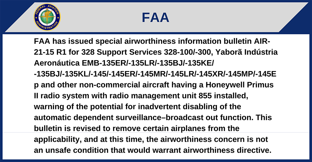 FAA has issued special airworthiness information bulletin AIR-21-15 R1 for 328 Support Services 328-100/-300, Yaborã Indústria Aeronáutica EMB-135ER/-135LR/-135BJ/-135KE/-135BJ/-135KL/-145/-145ER/-145MR/-145LR/-145XR/-145MP/-145Ep and other non-commercial aircraft having a Honeywell Primus II radio system with radio management unit 855 installed, warning of the potential for inadvertent disabling of the automatic dependent surveillance–broadcast out function. This bulletin is revised to remove certain airplanes from the applicability, and at this time, the airworthiness concern is not an unsafe condition that would warrant airworthiness directive.