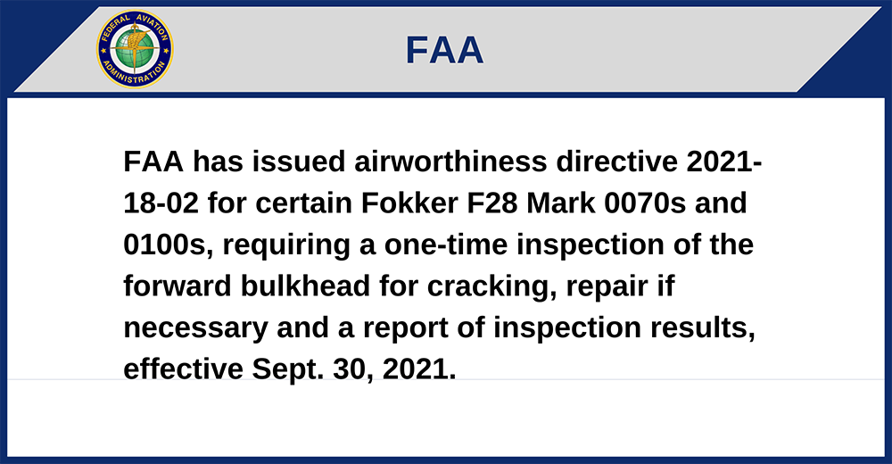 FAA has issued airworthiness directive 2021-18-02 for certain Fokker F28 Mark 0070s and 0100s, requiring a one-time inspection of the forward bulkhead for cracking, repair if necessary and a report of inspection results, effective Sept. 30, 2021.