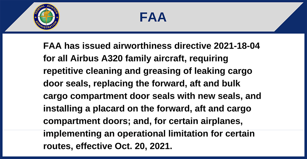 FAA has issued airworthiness directive 2021-18-04 for all Airbus A320 family aircraft, requiring repetitive cleaning and greasing of leaking cargo door seals, replacing the forward, aft and bulk cargo compartment door seals with new seals, and installing a placard on the forward, aft and cargo compartment doors; and, for certain airplanes, implementing an operational limitation for certain routes, effective Oct. 20, 2021.
