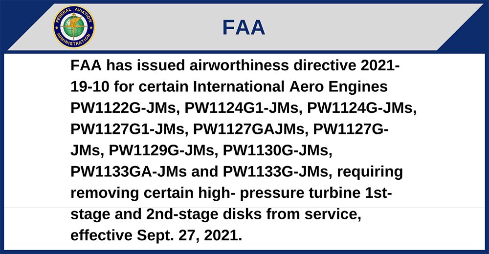 FAA has issued airworthiness directive 2021-19-10 for certain International Aero Engines PW1122G-JMs, PW1124G1-JMs, PW1124G-JMs, PW1127G1-JMs, PW1127GAJMs, PW1127G-JMs, PW1129G-JMs, PW1130G-JMs, PW1133GA-JMs and PW1133G-JMs, requiring removing certain high- pressure turbine 1st-stage and 2nd-stage disks from service, effective Sept. 27, 2021.