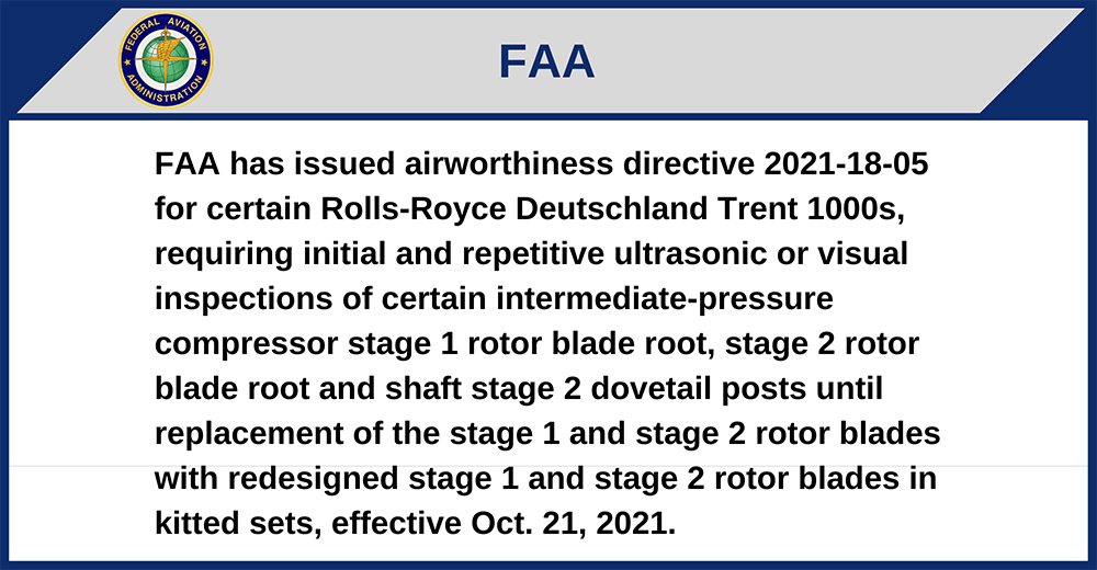 FAA has issued airworthiness directive 2021-18-05 for certain Rolls-Royce Deutschland Trent 1000s, requiring initial and repetitive ultrasonic or visual inspections of certain intermediate-pressure compressor stage 1 rotor blade root, stage 2 rotor blade root and shaft stage 2 dovetail posts until replacement of the stage 1 and stage 2 rotor blades with redesigned stage 1 and stage 2 rotor blades in kitted sets, effective Oct. 21, 2021.