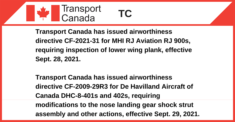 Transport Canada has issued airworthiness directive CF-2021-31 for MHI RJ Aviation RJ 900s, requiring inspection of lower wing plank, effective Sept. 28, 2021.
