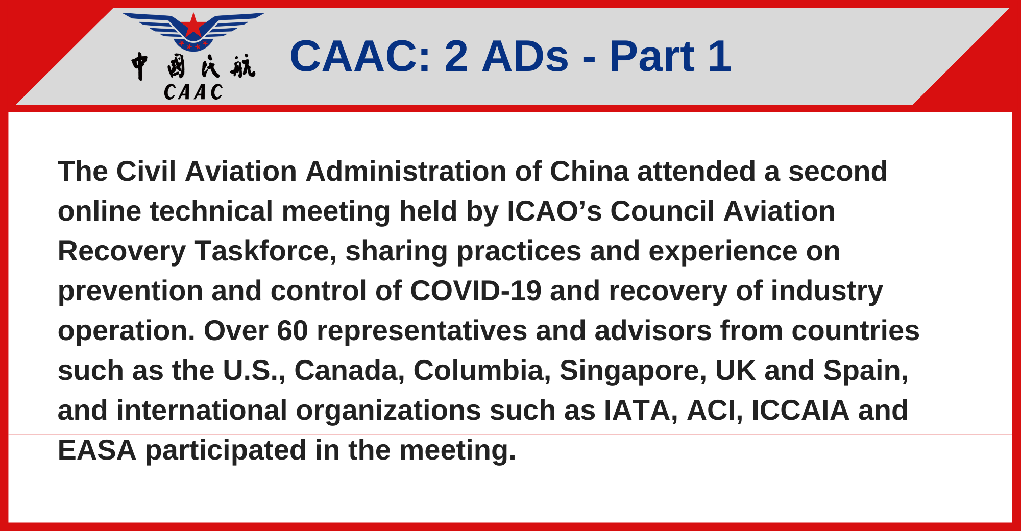 The Civil Aviation Administration of China attended a second online technical meeting held by ICAO’s Council Aviation Recovery Taskforce, sharing practices and experience on prevention and control of COVID-19 and recovery of industry operation. Over 60 representatives and advisors from countries such as the U.S., Canada, Columbia, Singapore, UK and Spain, and international organizations such as IATA, ACI, ICCAIA and EASA participated in the meeting.