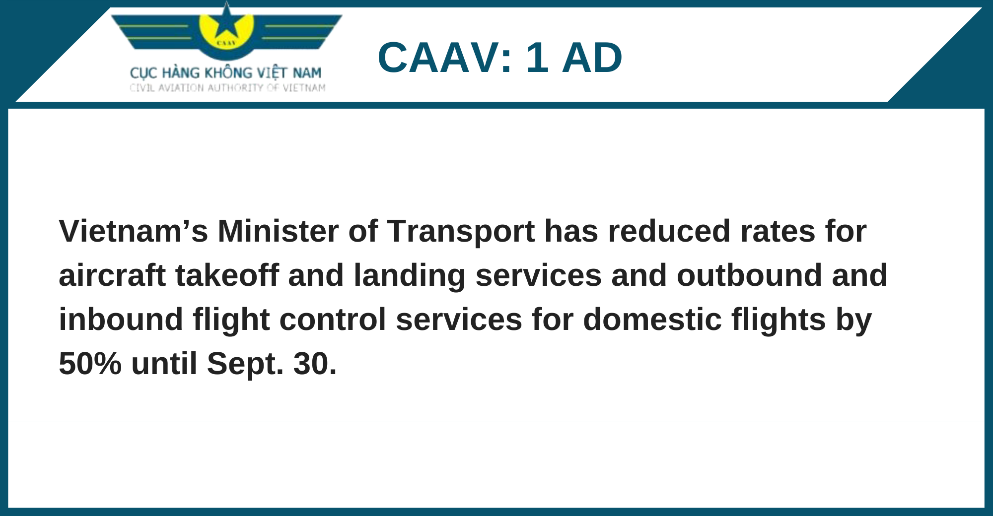 Vietnam’s Minister of Transport has reduced rates for aircraft takeoff and landing services and outbound and inbound flight control services for domestic flights by 50% until Sept. 30.