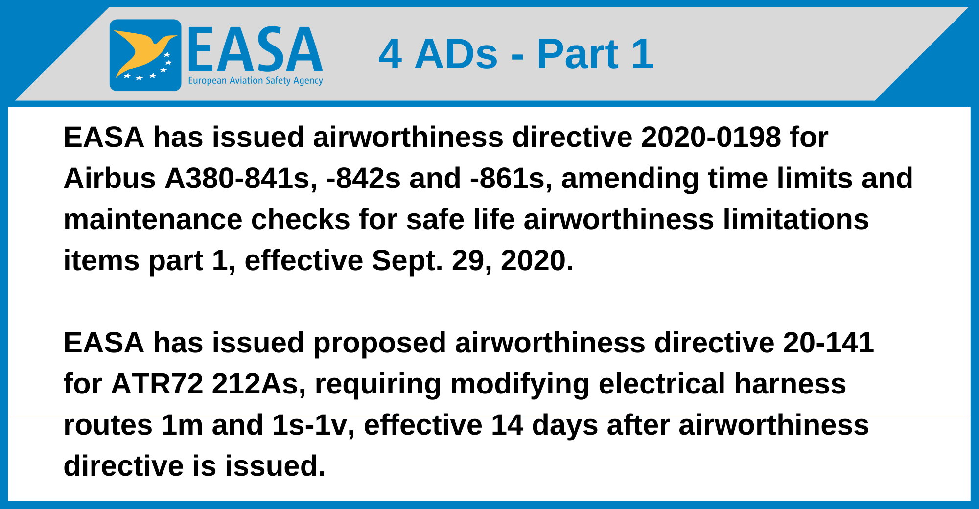 EASA has issued airworthiness directive 2020-0198 for Airbus A380-841s, -842s and -861s, amending time limits and maintenance checks for safe life airworthiness limitations items part 1, effective Sept. 29, 2020.