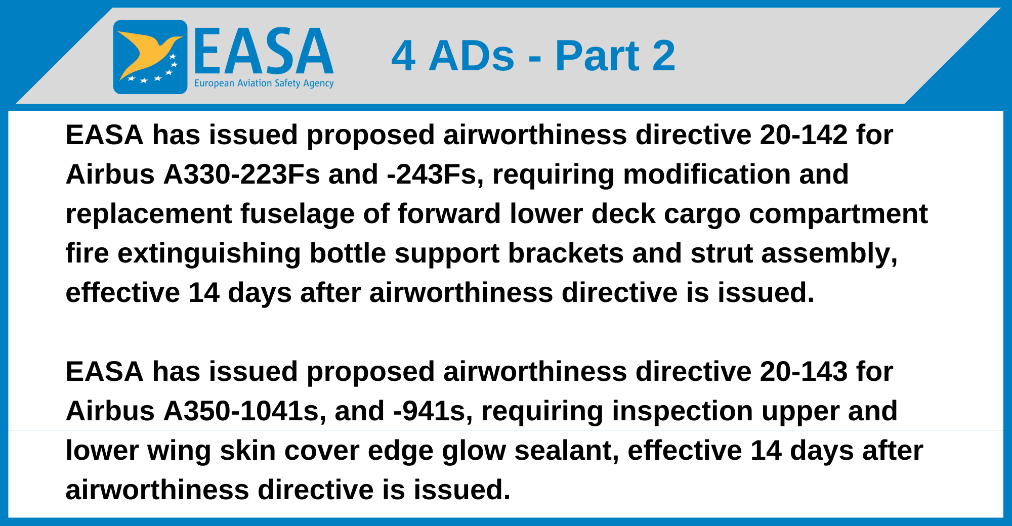 EASA has issued proposed airworthiness directive 20-143 for Airbus A350-1041s, and -941s, requiring inspection upper and lower wing skin cover edge glow sealant, effective 14 days after airworthiness directive is issued.