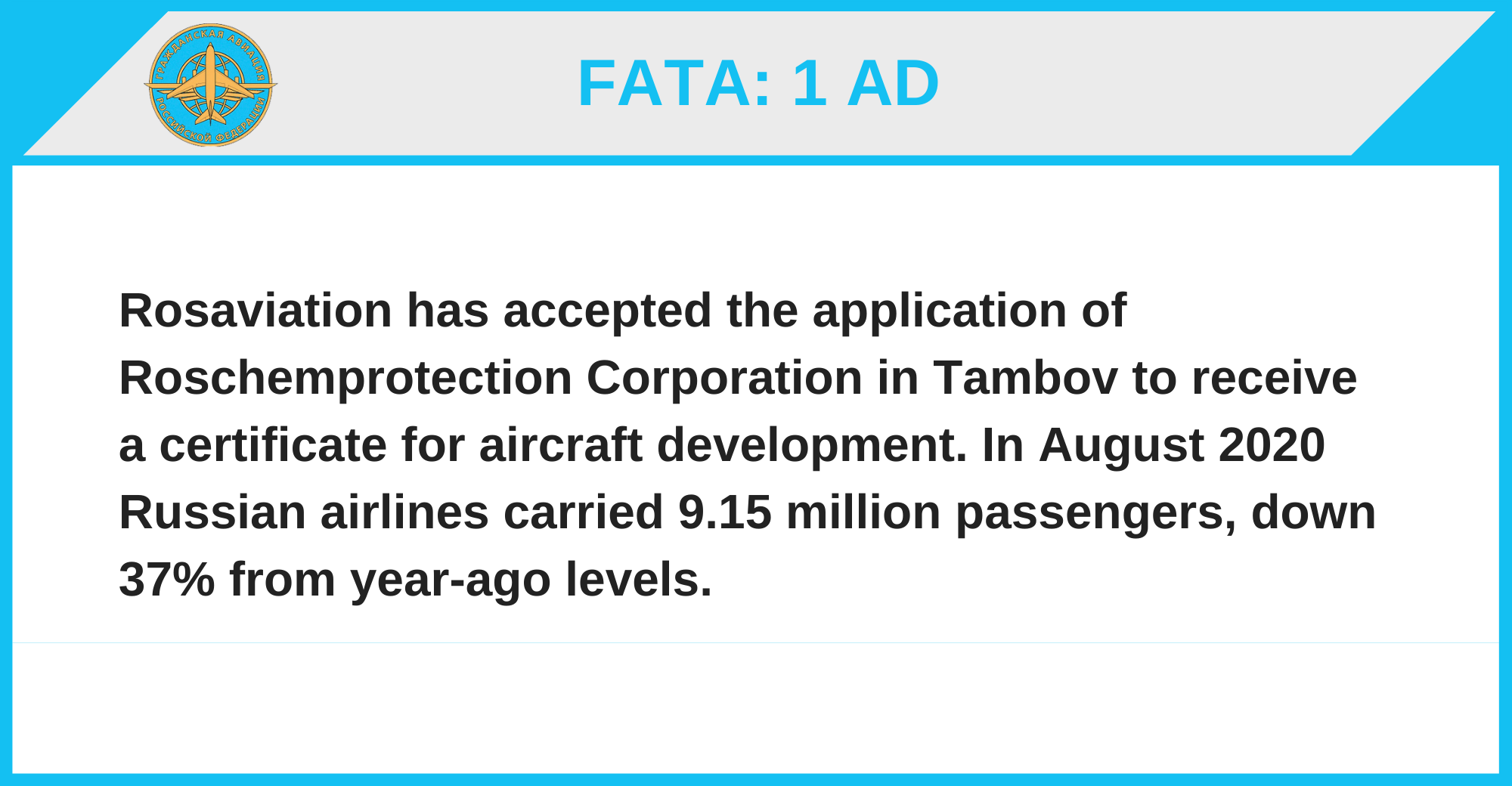 Rosaviation has accepted the application of Roschemprotection Corporation in Tambov to receive a certificate for aircraft development. In August 2020 Russian airlines carried 9.15 million passengers, down 37% from year-ago levels.