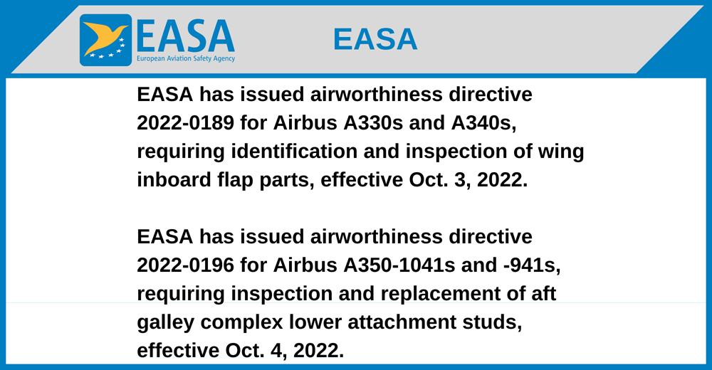 EASA has issued airworthiness directive 2022-0189 for Airbus A330s and A340s, requiring identification and inspection of wing inboard flap parts, effective Oct. 3, 2022.
