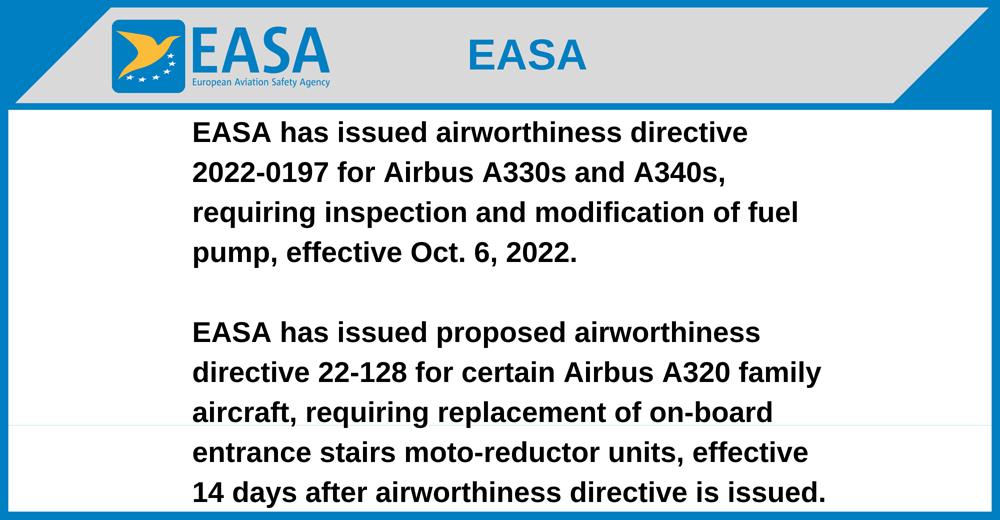 EASA has issued airworthiness directive 2022-0197 for Airbus A330s and A340s, requiring inspection and modification of fuel pump, effective Oct. 6, 2022.