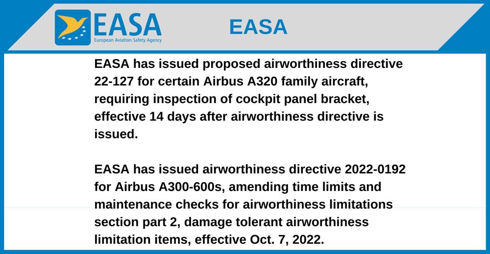 EASA has issued airworthiness directive 2022-0192 for Airbus A300-600s, amending time limits and maintenance checks for airworthiness limitations section part 2, damage tolerant airworthiness limitation items, effective Oct. 7, 2022.