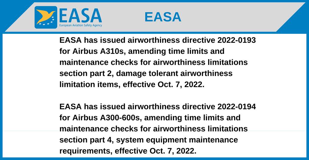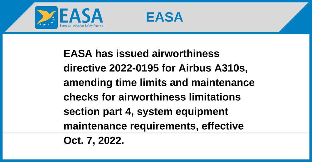 EASA has issued airworthiness directive 2022-0195 for Airbus A310s, amending time limits and maintenance checks for airworthiness limitations section part 4, system equipment maintenance requirements, effective Oct. 7, 2022.