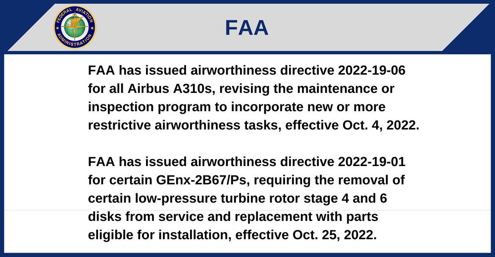 FAA has issued airworthiness directive 2022-19-06 for all Airbus A310s, revising the maintenance or inspection program to incorporate new or more restrictive airworthiness tasks, effective Oct. 4, 2022.
