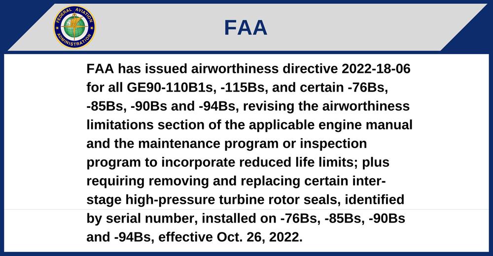 FAA has issued airworthiness directive 2022-18-06 for all GE90-110B1s, -115Bs, and certain -76Bs, -85Bs, -90Bs and -94Bs, revising the airworthiness limitations section of the applicable engine manual and the maintenance program or inspection program to incorporate reduced life limits; plus requiring removing and replacing certain inter-stage high-pressure turbine rotor seals, identified by serial number, installed on -76Bs, -85Bs, -90Bs and -94Bs, effective Oct. 26, 2022.