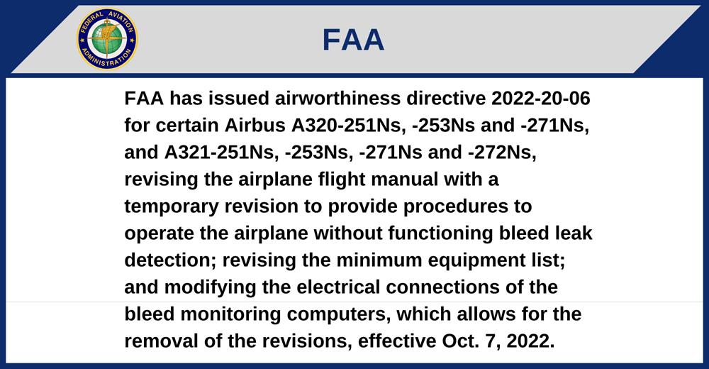 FAA has issued airworthiness directive 2022-20-06 for certain Airbus A320-251Ns, -253Ns and -271Ns, and A321-251Ns, -253Ns, -271Ns and -272Ns, revising the airplane flight manual with a temporary revision to provide procedures to operate the airplane without functioning bleed leak detection; revising the minimum equipment list; and modifying the electrical connections of the bleed monitoring computers, which allows for the removal of the revisions, effective Oct. 7, 2022.