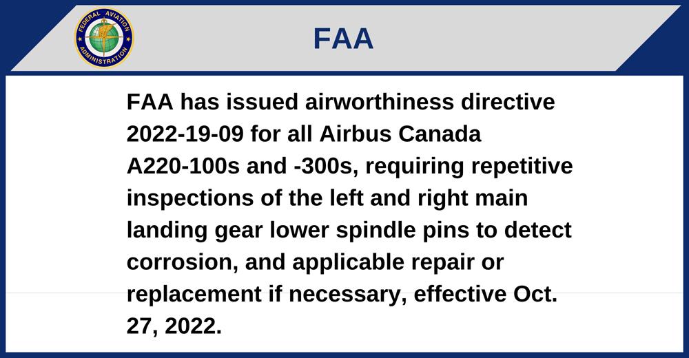 FAA has issued airworthiness directive 2022-19-09 for all Airbus Canada A220-100s and -300s, requiring repetitive inspections of the left and right main landing gear lower spindle pins to detect corrosion, and applicable repair or replacement if necessary, effective Oct. 27, 2022.