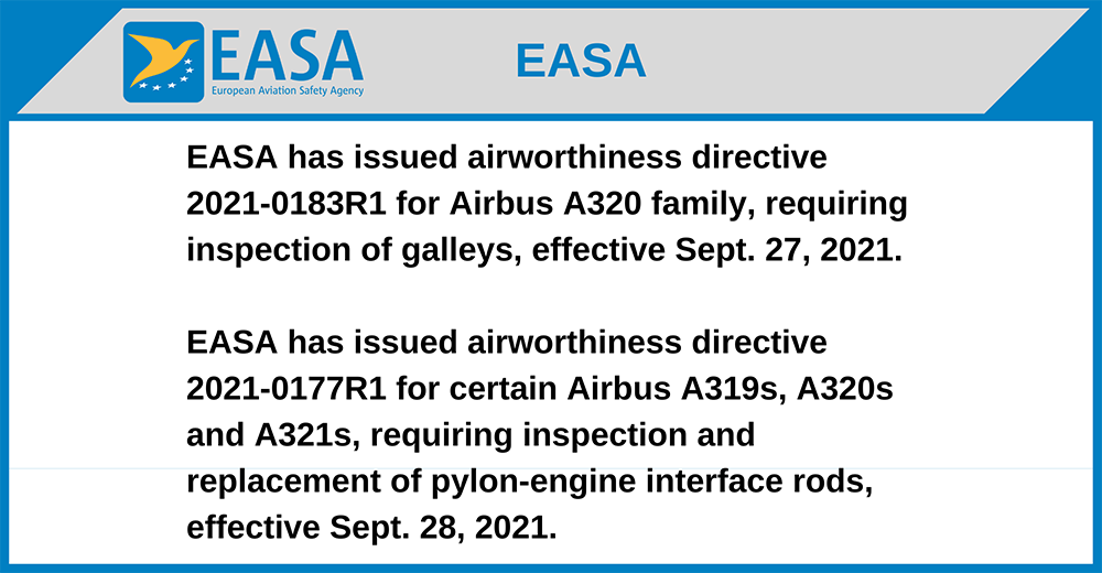 EASA has issued airworthiness directive 2021-0183R1 for Airbus A320 family, requiring inspection of galleys, effective Sept. 27, 2021.
