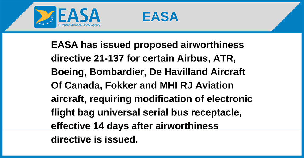 EASA has issued proposed airworthiness directive 21-137 for certain Airbus, ATR, Boeing, Bombardier, De Havilland Aircraft Of Canada, Fokker and MHI RJ Aviation aircraft, requiring modification of electronic flight bag universal serial bus receptacle, effective 14 days after airworthiness directive is issued.