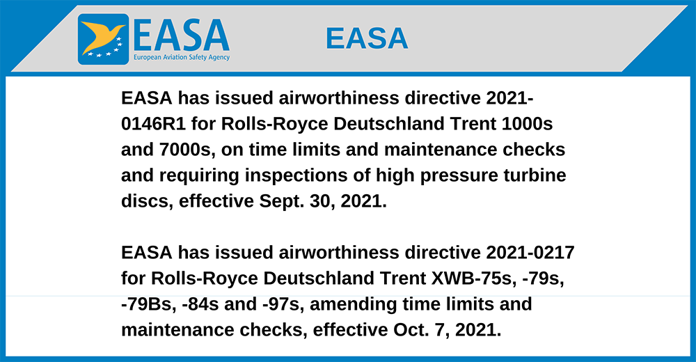 EASA has issued airworthiness directive 2021-0146R1 for Rolls-Royce Deutschland Trent 1000s and 7000s, on time limits and maintenance checks and requiring inspections of high pressure turbine discs, effective Sept. 30, 2021.