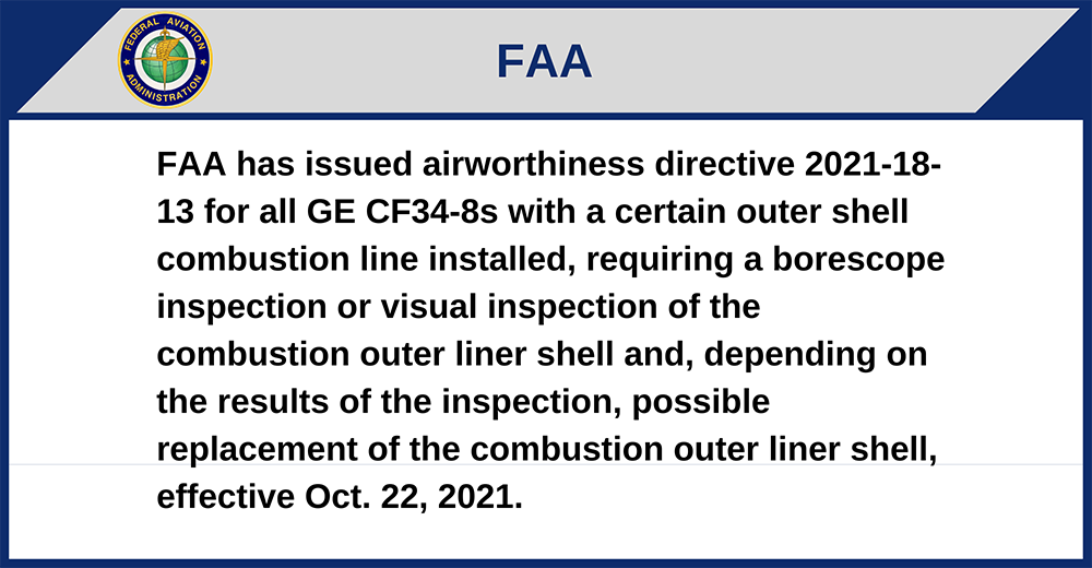 FAA has issued airworthiness directive 2021-18-13 for all GE CF34-8s with a certain outer shell combustion line installed, requiring a borescope inspection or visual inspection of the combustion outer liner shell and, depending on the results of the inspection, possible replacement of the combustion outer liner shell, effective Oct. 22, 2021.