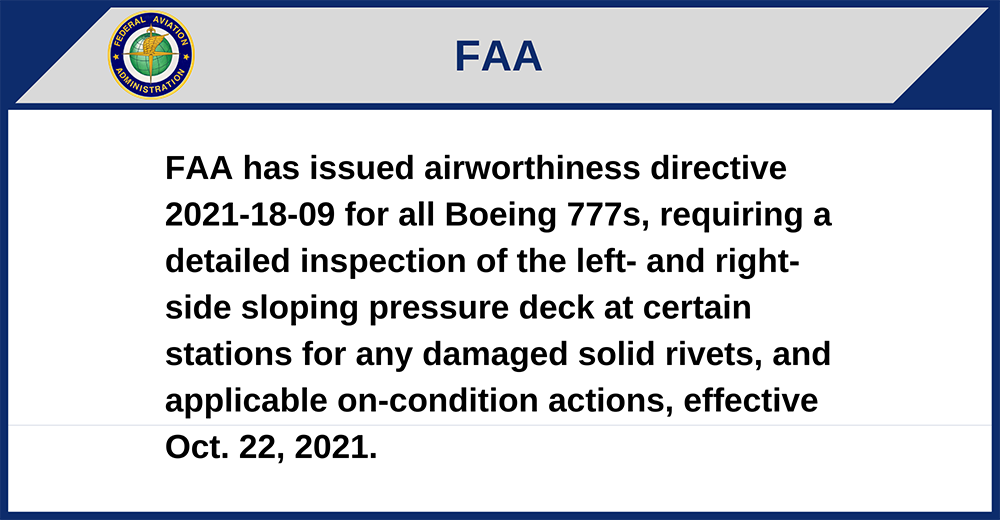 FAA has issued airworthiness directive 2021-18-09 for all Boeing 777s, requiring a detailed inspection of the left- and right-side sloping pressure deck at certain stations for any damaged solid rivets, and applicable on-condition actions, effective Oct. 22, 2021.