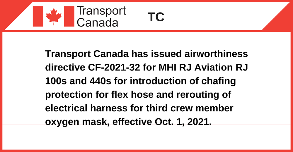 Transport Canada has issued airworthiness directive CF-2021-32 for MHI RJ Aviation RJ 100s and 440s for introduction of chafing protection for flex hose and rerouting of electrical harness for third crew member oxygen mask, effective Oct. 1, 2021.