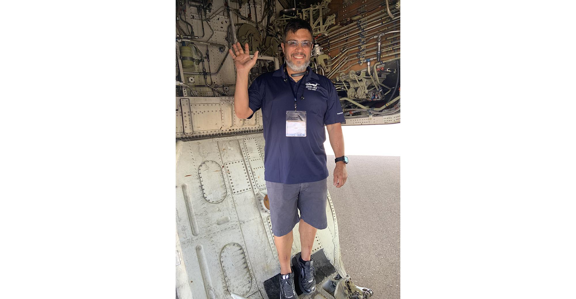 Jose Ramirez, an AMT and crew chief, in the hydraulics bay near the landing gear. He said the thrust reverser valve and air conditioning units were some of the least desirable parts to maintain.