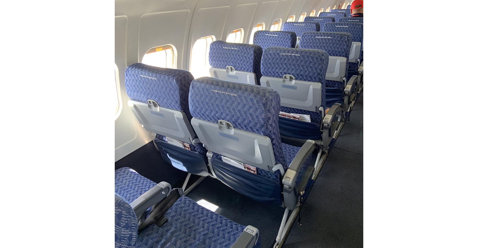The cabin was in a 2-by-3 seat configuration with comfortable, cloth-covered seats--and more legroom than newer narrowbodies.