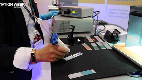 From the exhibition floor at MRO Europe 2017, Virginia Hogan from Dymax demonstrates the company's See-Cure adhesive technology and explains how it can be used for coating processes with aircraft engine parts, avionics and helicopter rotor blades.
