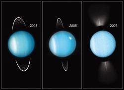 These three Hubble Space Telescope images show the rings of Uranus—which were discovered in 1977—approaching an edge-on view from Earth that occurs only every 42 years. In the Aug. 14 image at the right, glare from Uranus itself overwhelms the view of the edge-on rings across the planet’s face...