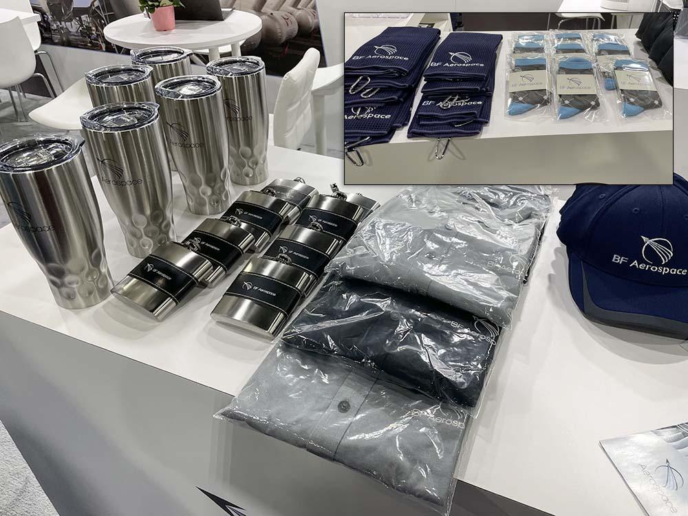 Whether your beverage of choice is coffee or whiskey, BF Aerospace has you covered with thermoses and flasks, as well as button down shirts, hats, socks and towels, at booth #3619.