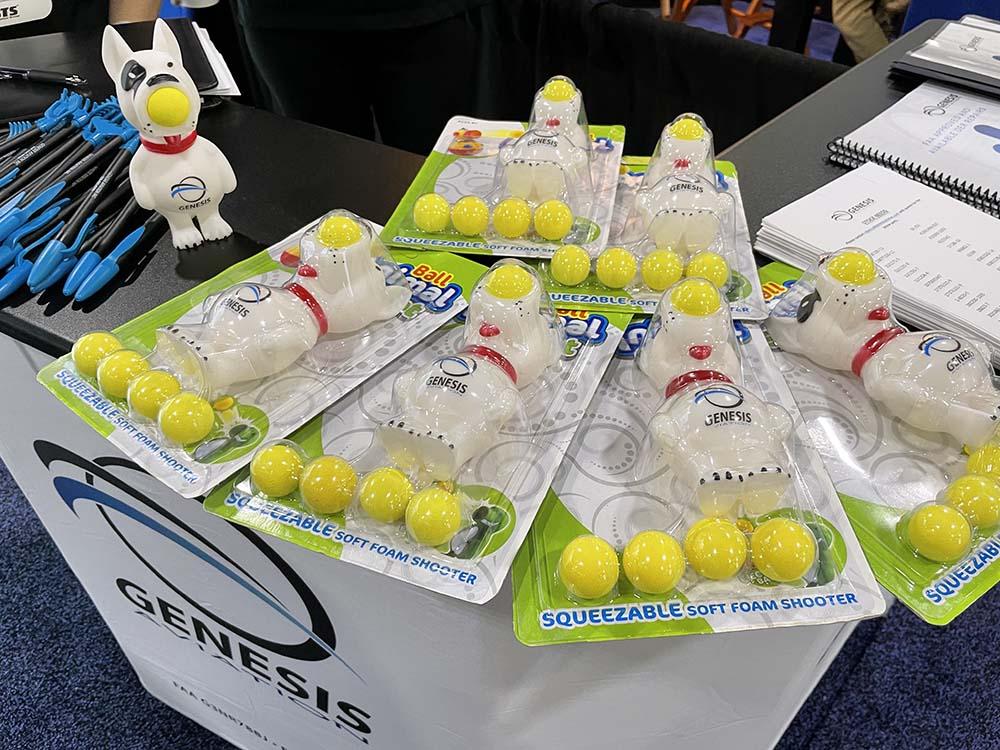 Dogs and kids (or even adults) alike can enjoy these dog-themed toys that shoot balls out of their mouths. Grab one at Genesis Aviation’s booth (#2006).