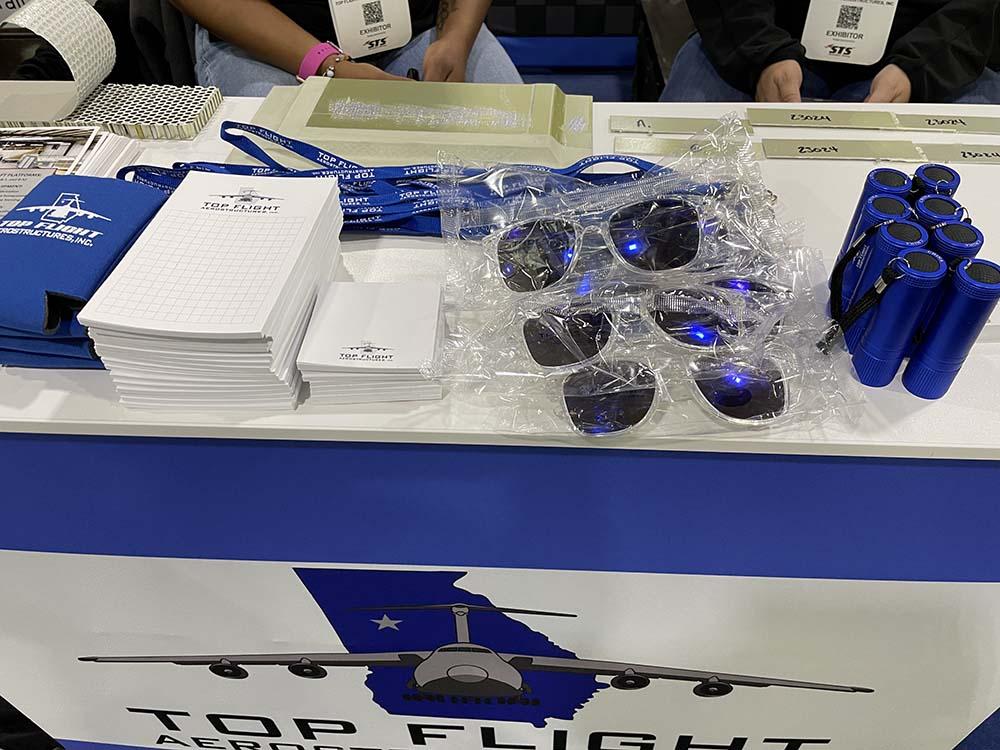 Whether it’s too dark or too bright out, Top Flight Aerostructures has you prepared with sunglasses and flashlights—as well as drink koozies and notepads—at booth #3847.