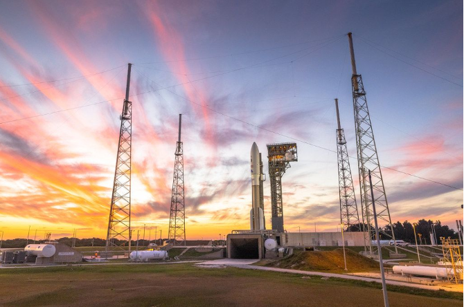 The United Launch Alliance (ULA) Atlas V rocket and the United States Space Force’s STP-3 mission sit on Space Launch Complex 41 (SLC-41) at Cape Canaveral at sunset.