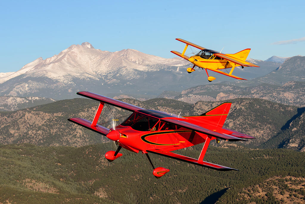 With Mount Meeker as a backdrop, this pair of brightly colored and unique home-built aircraft known as Sorrell HiperBipes, fly near Longmont, Colorado. The red aircraft was built by Doug Eastman, who also owns and flies the aircraft. The yellow bird is flown by Guy Barrow and was built by his father.