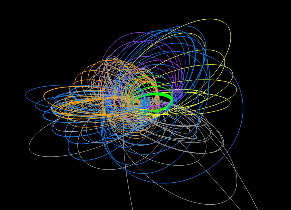 The $3.2 billion U.S./European Cassini probe is scheduled to drop into Saturn’s cloudy atmosphere on Sept. 15, bringing down the curtain on a 13-year tour of a planetary system with so many moving parts it almost rivals the Solar System in complexity. The route taken by Cassini since it arrived at its target on July 1, 2004, is equally complicated. With different colors denoting different phases of the mission, the trajectory is known as the ball of yarn.