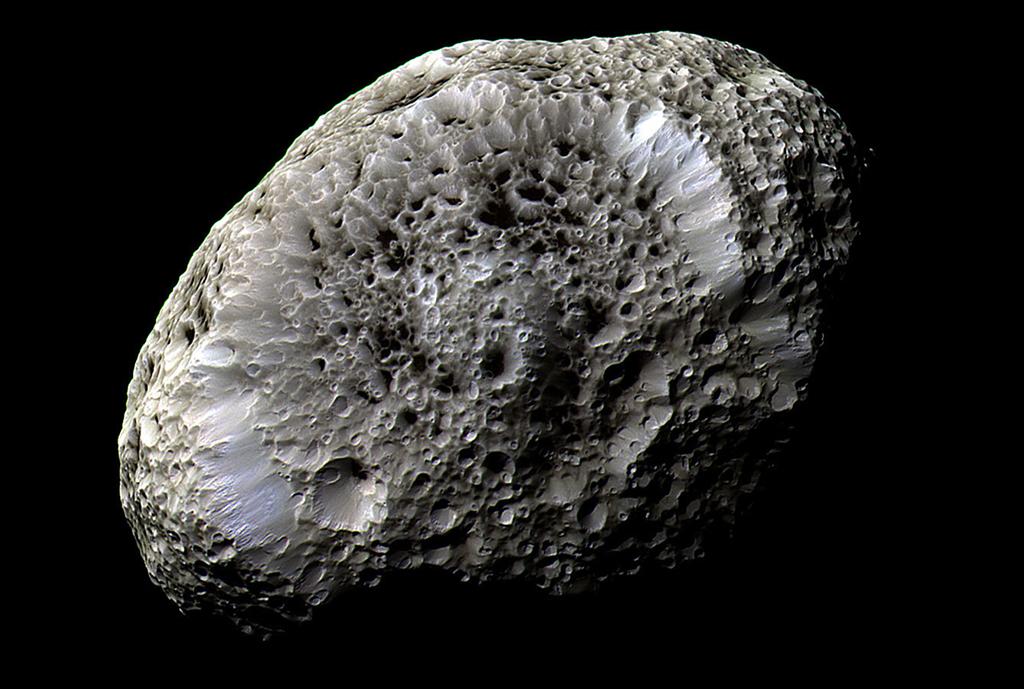 Saturn’s tiny moon Hyperion looks like something from the bottom of the sea, with deep craters sheltering a mysterious dark material. Measuring only about 250 km (155 mi.) across, the moon rotates chaotically.
