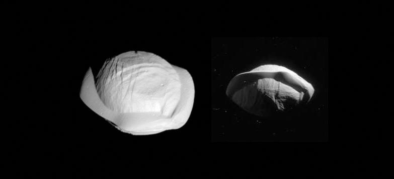 Pan’s flying-saucer shape mimics Saturn and its rings, and may have been created as the moon’s relatively dense core cleared a path through the larger rings. Pan’s gravity is so low the debris was able to pile much higher than it would on a larger body.