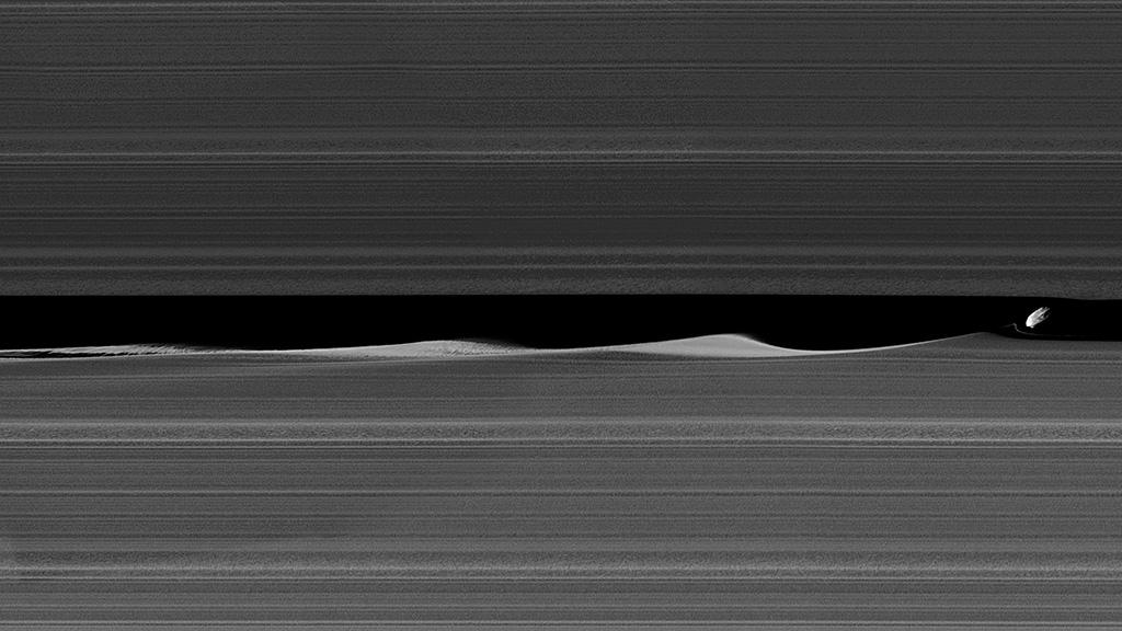 Daphnis, a moon embedded in Saturn’s rings, has just enough of an inclination that it pulls the ring material into waves that would appear as sheer mountains to an astronaut cruising alongside them. The moon is only 5 mi. across.