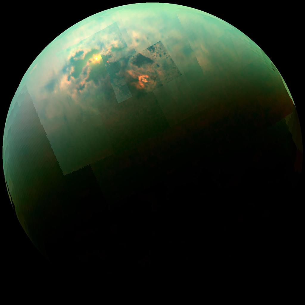 Titan is wet, but not with water. Despite temperatures approaching −300F, its surface flows with liquid hydrocarbons, and its atmosphere has hydrocarbon weather. At the big moon’s poles the liquid pools in dark seas, as in Kraken Mare visible in this near-infrared color mosaic. Sunlight is reflected in the sea’s surface.