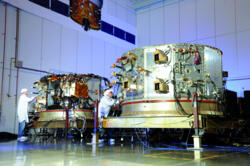 The initial two service modules for the Orbital Sciences Corp. Cygnus commercial cargo carrier, which is scheduled to fly to the International Space Station this year, are nearing completion at the company's factory in Dulles, Va. The module on the left is set to go first, in a demonstration flight...