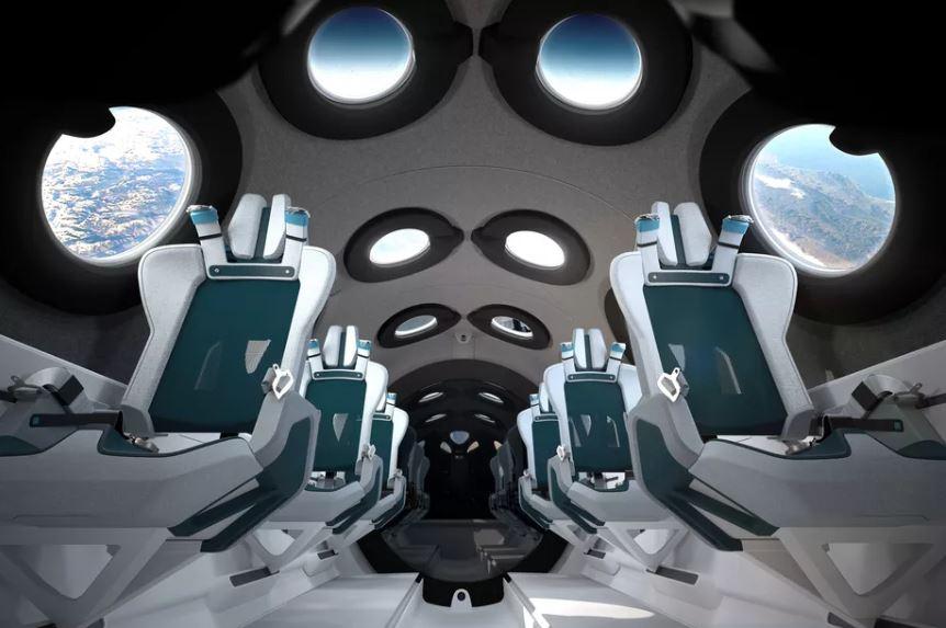 The six seats are attached to the vehicle’s sidewalls, leaving the floor space open. They are set up in three rows, with one seat along each side of the cabin, which is 7.5 ft. (2.3 m) in diameter. The passenger section is set slightly below the cockpit, which will be occupied by two Virgin Galactic pilots.