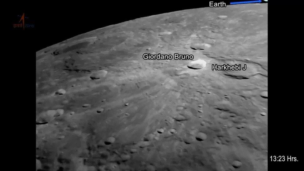The craters Giordano Bruno and Harkhebi J are seen here in this image taken Aug. 17 by Chandrayaan-3's Lander Imager Camera 1. Further in the background, the Earth is barely seen peeking from behind the Moon.
