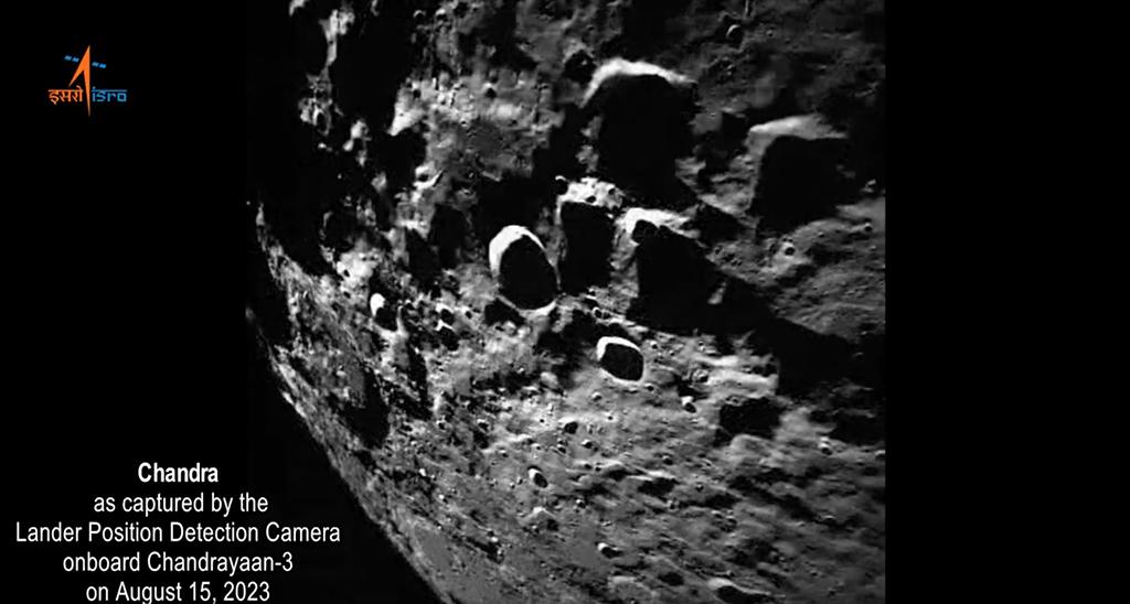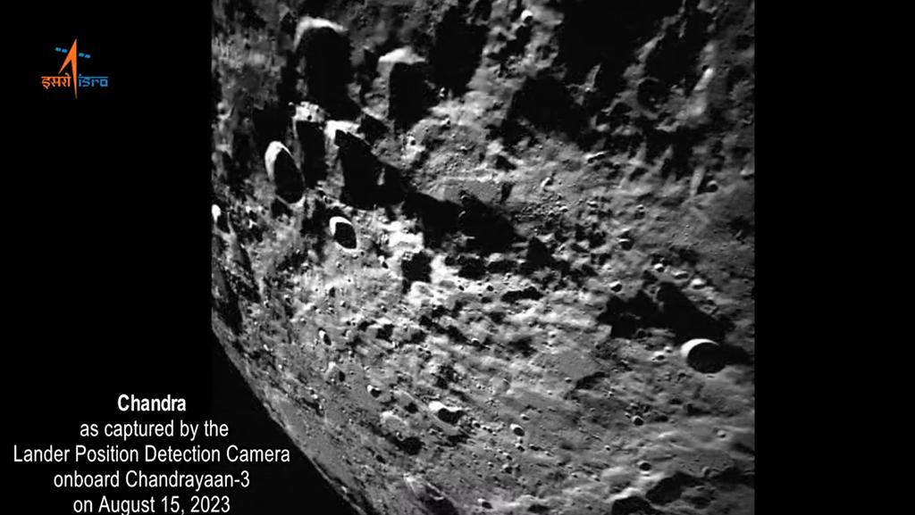 Chandrayaan-3's Lander Position Detection Camera (LPDC) on the Vikram lander took this image Aug. 15 as the lander got a clearer and more close-up view of the lunar surface.