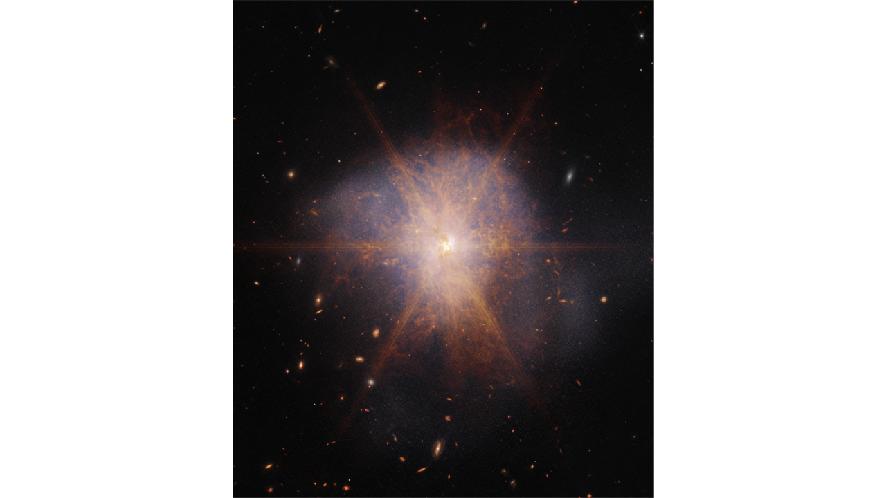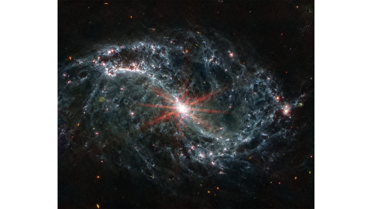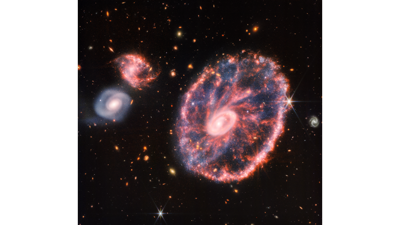 This composite image of the Cartwheel Galaxy from NIRCam and MIRI shows the results of a high-speed collision that caused the formation of the galaxy about 400 million years ago. The bright red streaks between the inner and outer rings of the galaxy are caused by glowing dust that is rich in hydrocarbons. Among the red dust are blue dots, which indicate previously existing stars and new star formation.