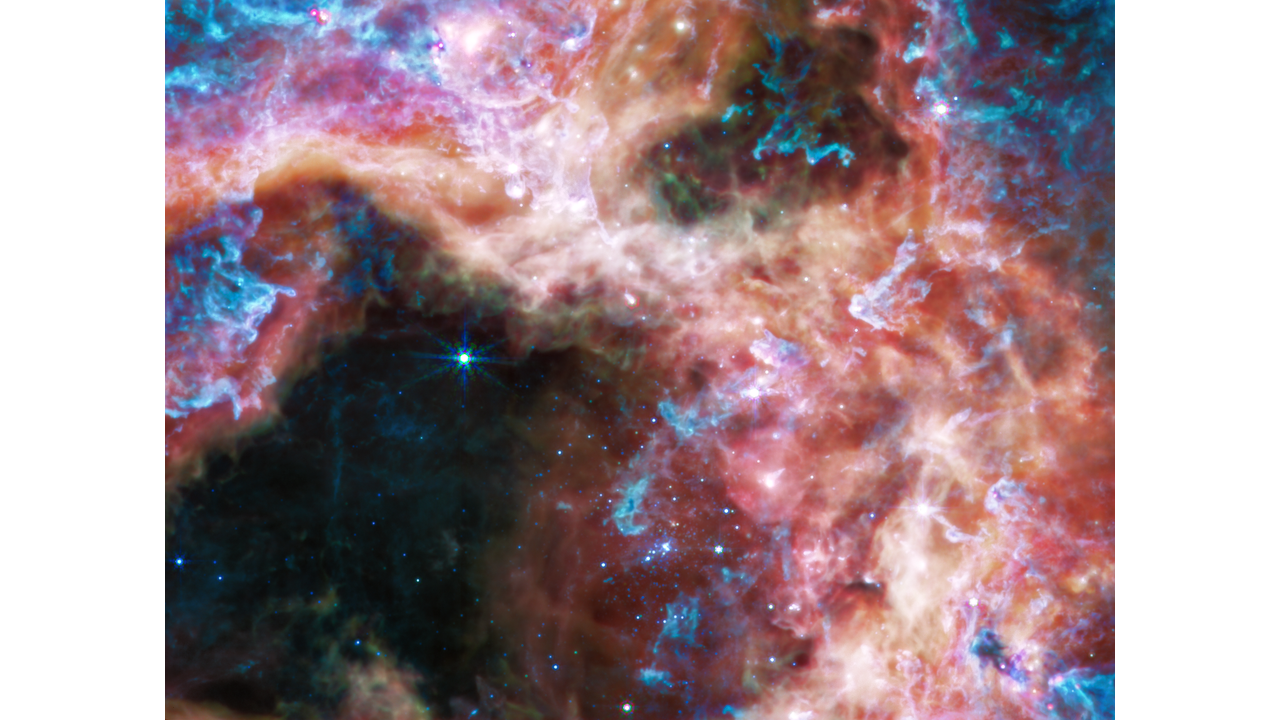 This NIRCam mosaic shows the Tarantula Nebula and displays thousands of young stars in the center of the image made visible through the dense dust because of the near-infrared wavelengths used to take the image. At the edge of the image, cooler, rust-colored gas is material that will create new stars.
