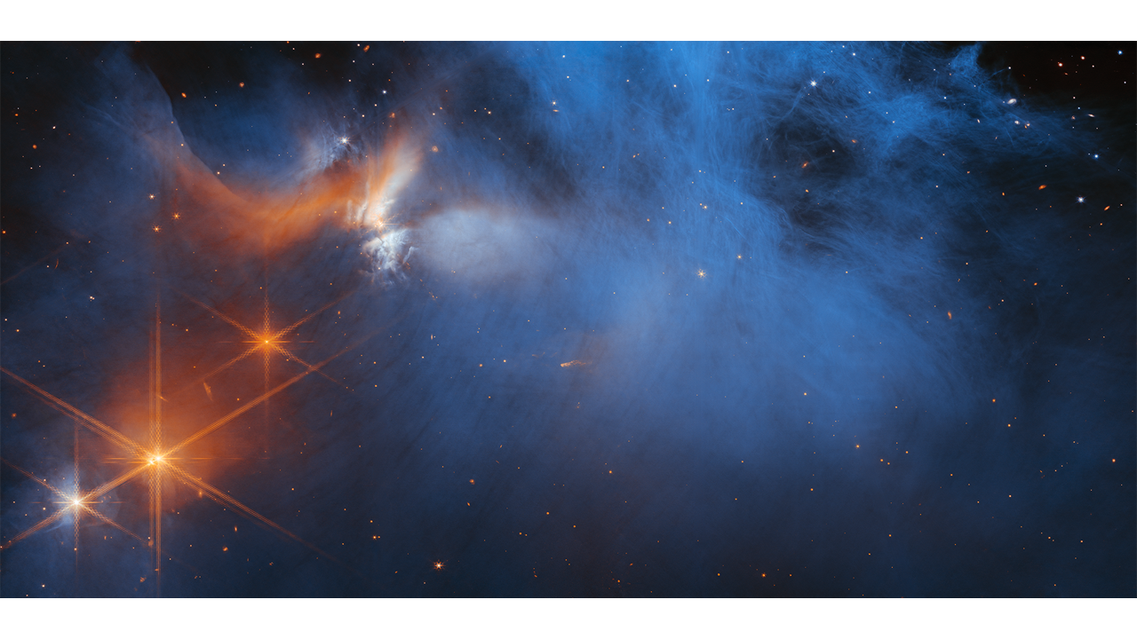 This NIRCam image details the central area of the Chamaeleon I dark molecular cloud, located just 650 light-years away. The orange material in the upper left denotes the young protostar Ced 110 IRS 4, which illuminates the cold blue cloud material in the center of the image. Diverse ices can be detected in the cloud as the ices absorb light from the stars in the background.