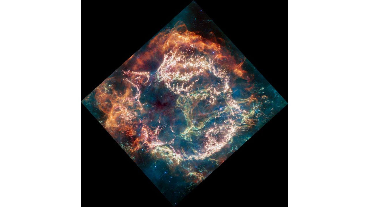 Data from various filters from MIRI were combined to create this image of Cassiopeia A, a supernova remnant located in the constellation Cassiopeia about 11,000 light-years away. The remnant’s exterior contains orange and red materials from the emission of warm dust where ejected material from the supernova hits the surrounding material. The shiny bright pink denotes stellar material, while the shape and complexity of the green in the central cavity of the remnant is challenging for scientists to understand.